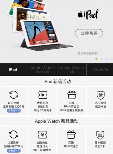 苏宁易购价格方面,第8代iPad 32GB售价2499元,128GB售价2999元;Apple Watch Series 6售价3199元起;Apple Watch SE售价2399元起。新品爱不释手,囊中却很“羞涩”?用苏宁金融任性付分期,即享0首付12期免息,把最新正品行货提前领回家。此外,以旧换新至高1200元补贴、购买还赠PP体育会员、苏宁延保低至6折等优惠不停,超值购新机,畅享多权益。