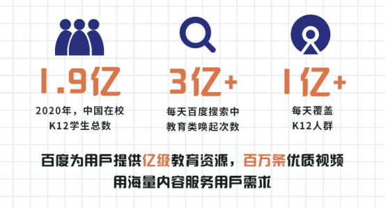 2020年疫情后,经历了停课、复课以及不同地方的疫情反复,学生们开始花费大量时间居家学习,在家里上网课,完成作业。家长在这个过程中成为了督促孩子们学习的关键因素,无论是学生还是他们的家长,都因此产生了大量的教育内容需求,这些需求在百度搜索中体现的尤为明显。百度搜索中每天有3亿教育相关需求,其中三分之一都是K12相关内容。