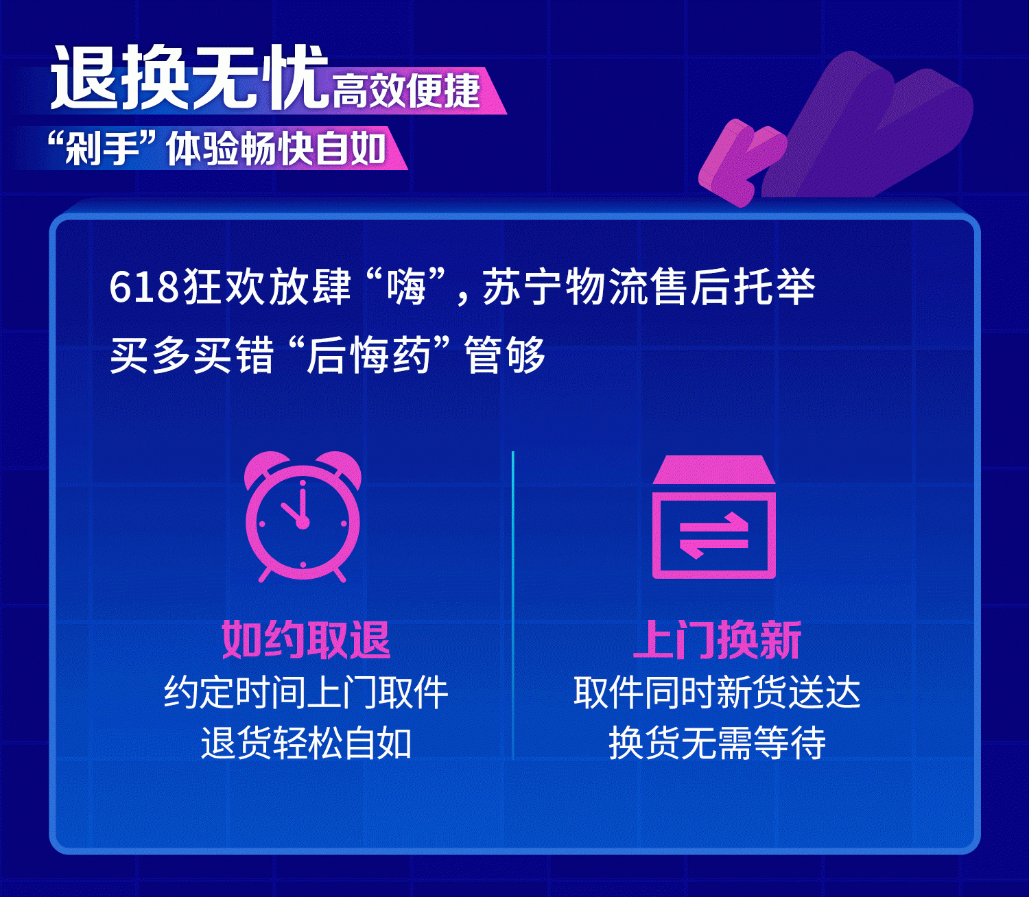 剁手一时爽,退货上火烦!大促期间, 逆向物流的优先级常常被降级。而苏宁物流“快速退”、“上门取件”、“上门换新”三大贴心服务助力“闪电级”退换货。
