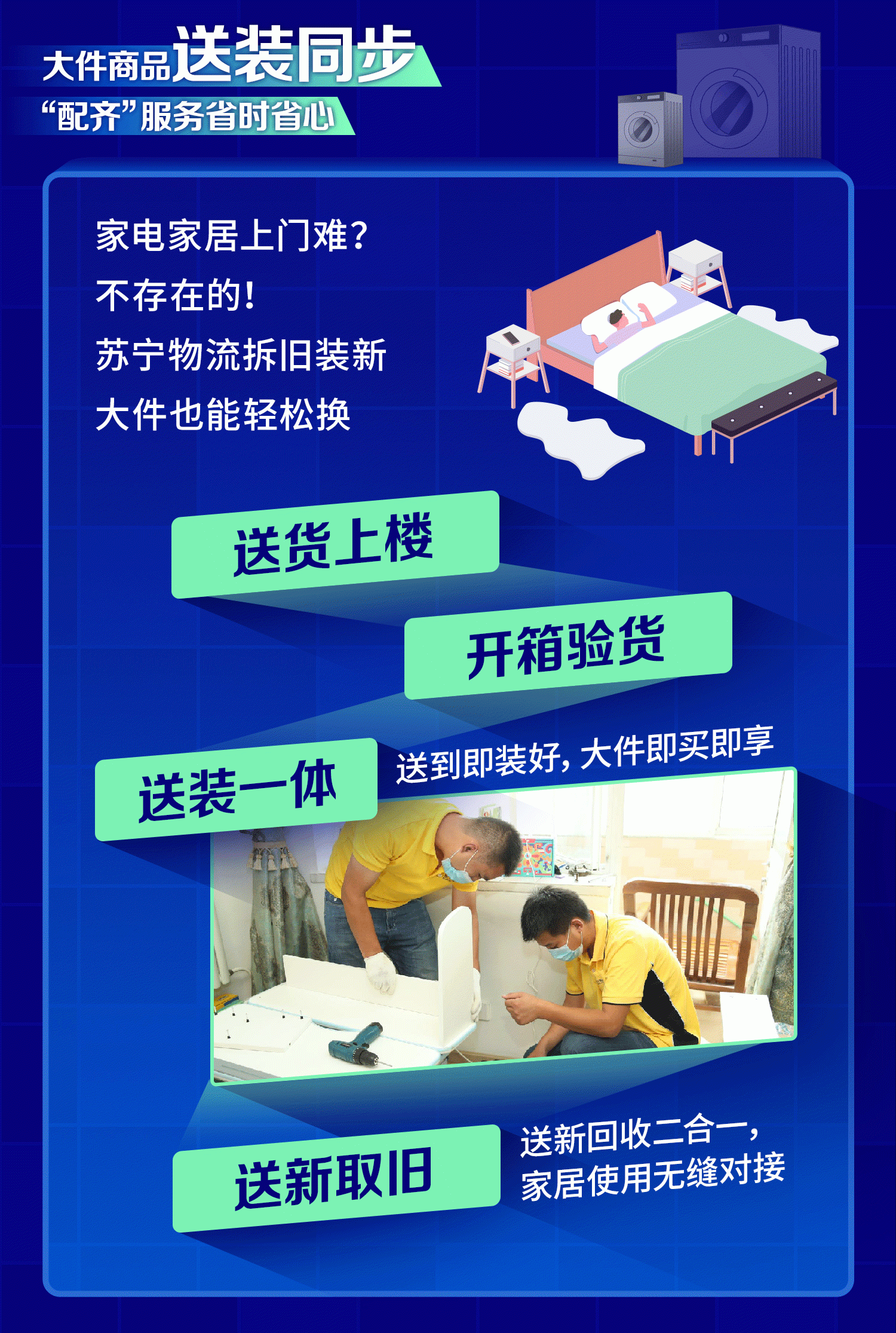 送前电联、送货上门一直是苏宁物流末端服务的“规范动作”,针对订单量持续暴增的家电、家居、健身器材等大件品类,除基本服务之外,苏宁物流还为用户提供“送装一体”、“送新取旧”服务,新家电、新家居等送货上门的同时,苏宁物流大件配送员还负责安装、拆旧、回收旧物等,目前这两项服务已覆盖全国300+城市。