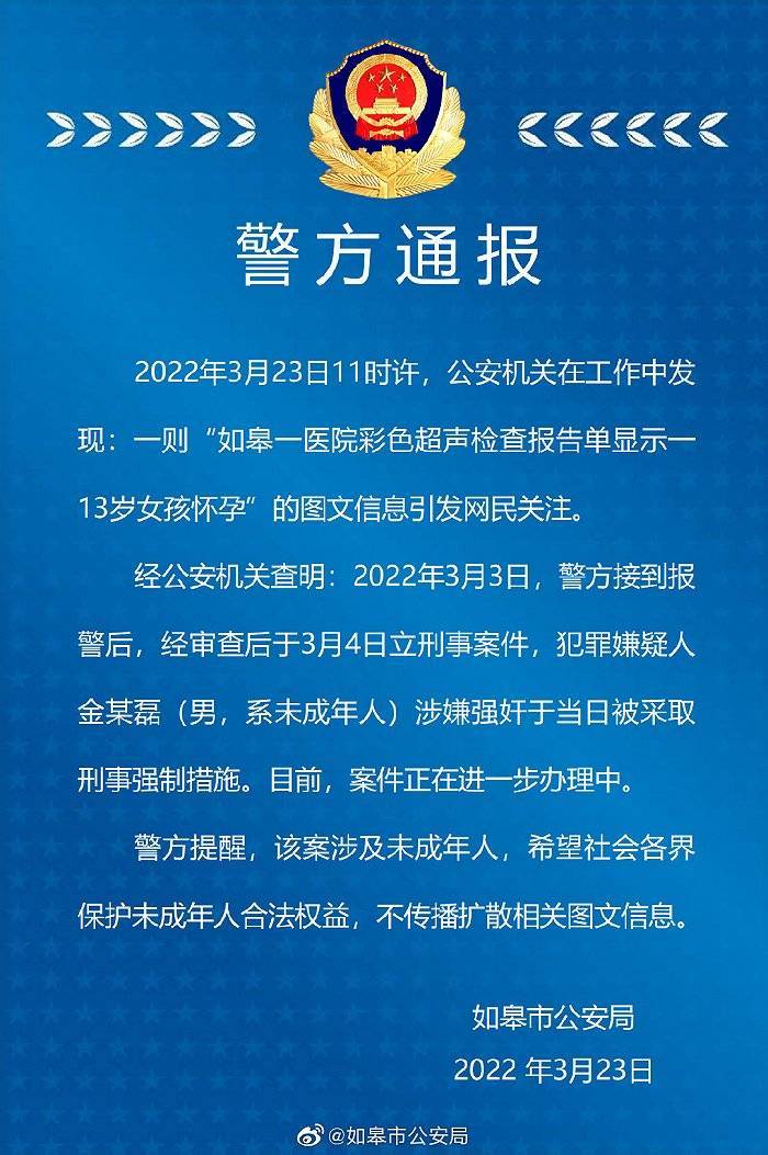 原标题:13岁女孩疑怀孕,嫌犯未成年被刑拘 警方以强奸罪立案
