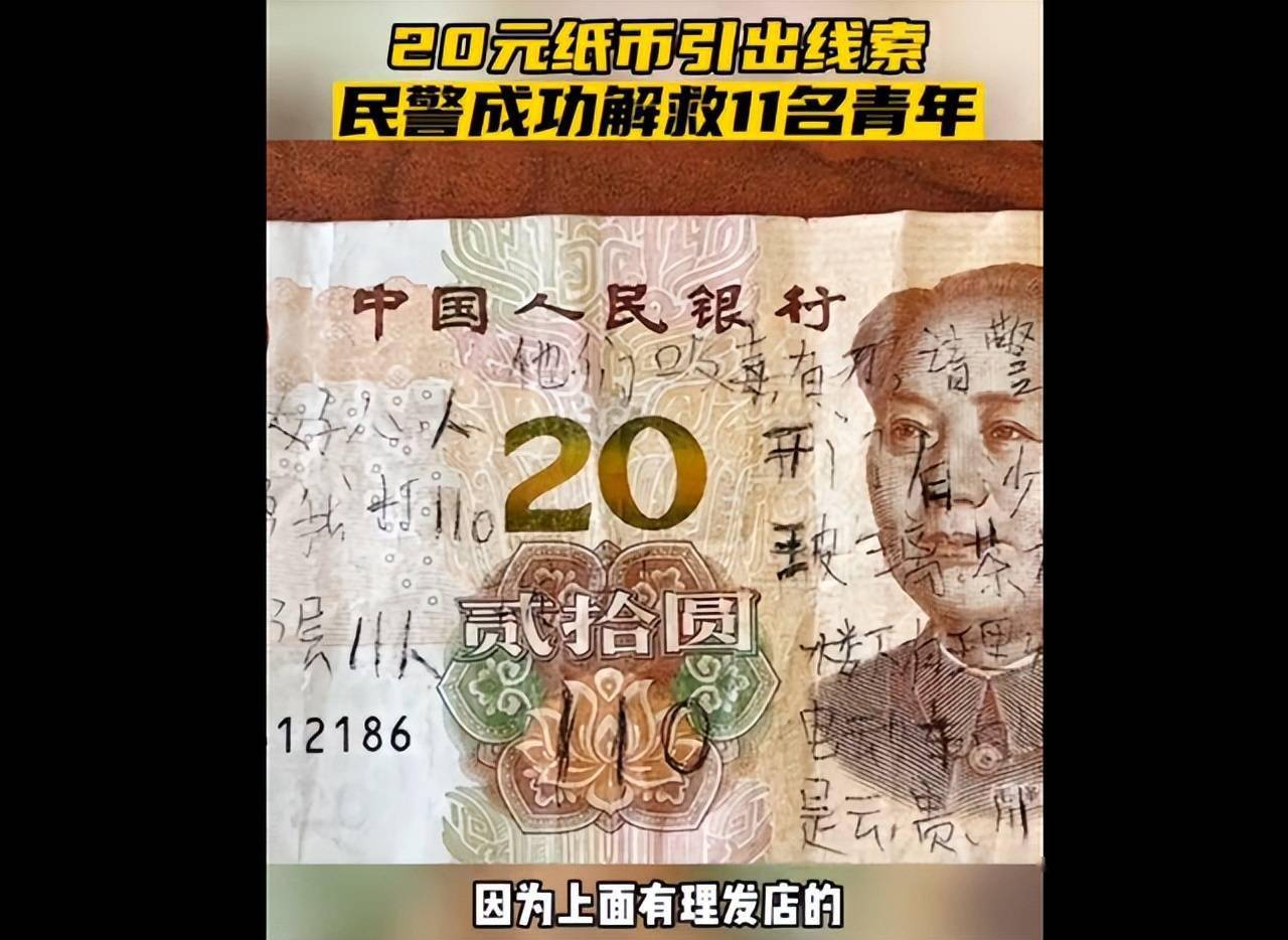 民警查看那张20元纸币,只见正面写着:“好心人,请帮我打110,本栋3层11人,他们有刀,请警察排查,开门有沙发、玻璃茶几,楼下有理发、修电动车的……”反面写着:“拨打110,本小区3层楼……”