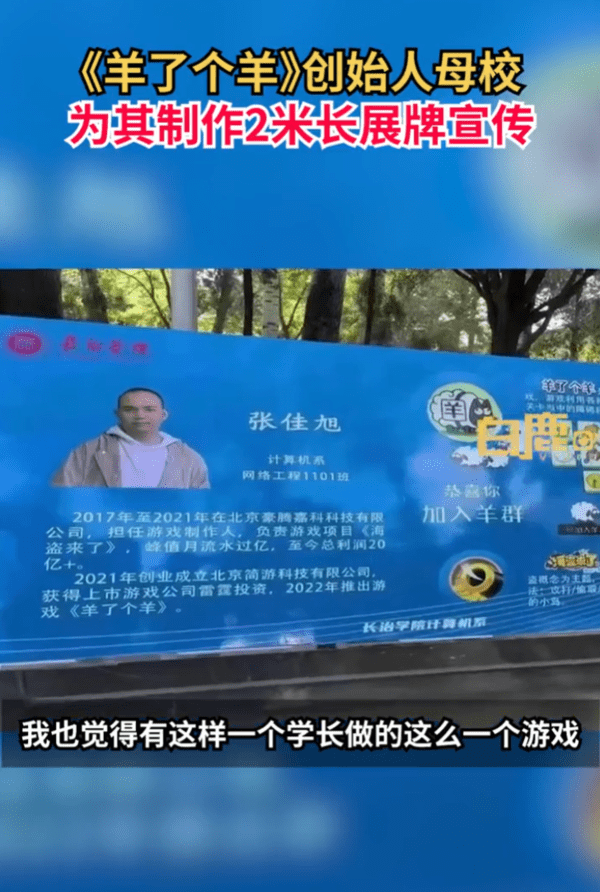 《羊了个羊》创始人母校为其制作2米长展牌宣传(图源微博)