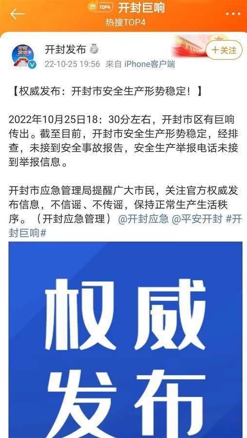 对此,10月25日晚,河南开封市委宣传部官方微博发布消息称,2022年10月25日18:30分左右,开封市区有巨响传出。截至目前,开封市安全生产形势稳定,经排查,未接到安全事故报告,安全生产举报电话未接到举报信息。