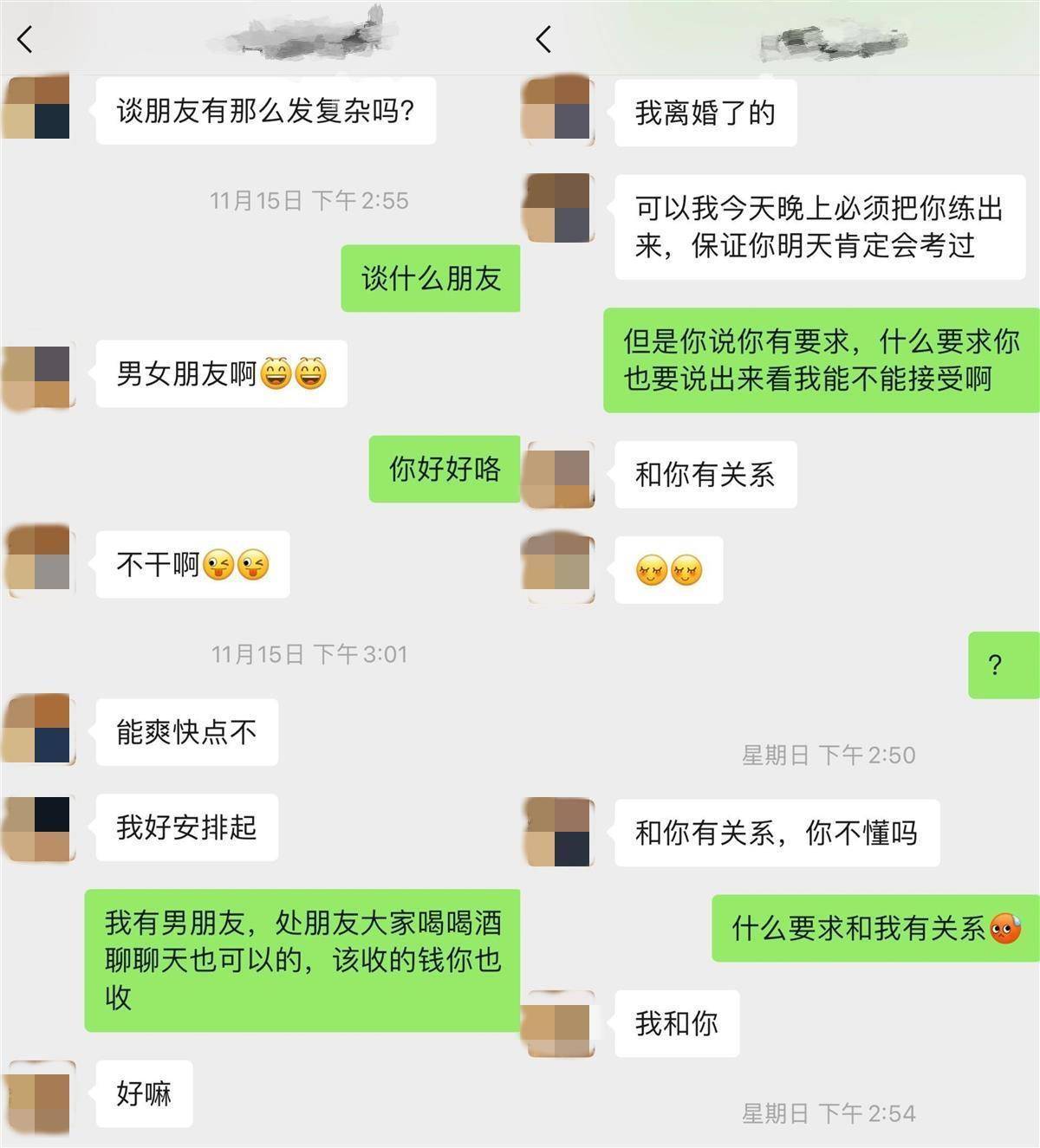 女子发布的聊天截图显示,驾校教练给女学员发信息询问带其练车有什么好处,“可以陪吃饭睡觉吗?”随后,教练称自己已离婚,要和女学员谈男女朋友。女学员拒绝,表示自己有男朋友。