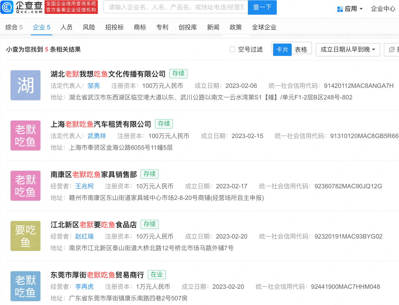 2月24日,据企查查APP报道,日前,热播剧《狂飙》中的一句台词“老默,我想吃鱼了”刷屏网络。企查查APP显示,近日,多家名为“老默吃鱼”公司成立,涉及湖北、上海、东莞等地,其中成立日期最早的为2月6日。此外,“老默我想吃鱼了”商标已被自然人杨某某申请注册,国际分类为广告销售,目前商标状态为“注册申请中”。