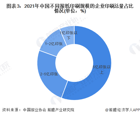 从不同印刷规模的企业报纸印刷总量占比来看,2021年,印刷量在5亿印张以上的企业总印刷量超过200亿印张,占比超过一半;其次是印刷量在2-5亿印张之间的企业总印刷量约100亿印张,占比约25%;印刷量在1亿印张以下的企业总印刷量占比仅有6%左右。整体来看,我国报纸印刷行业头部市场集中度较高。