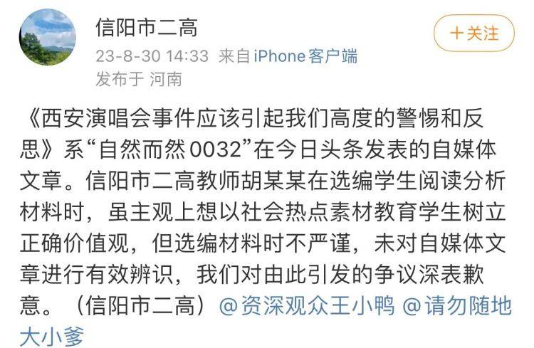 30日下午,名为“信阳市二高”的微博账号发布消息称《西安演唱会事件应该引起我们高度的警惕和反思》系自媒体文章。