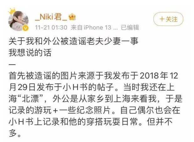 同年11月21日,小红书博主“Niki君”发微博称,她是合影中的女孩,那是她与外公的合照,但被人造谣为“老夫少妻”。据博主“Niki君”介绍,被造谣的图片源于其于2018年12月29日在某社交平台上发布的帖子。当时,她还在上海“漂”,外公从家乡到上海来看她。