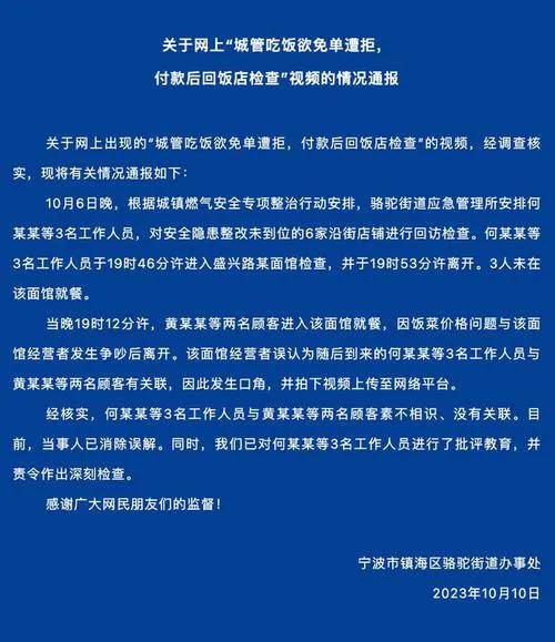 随后,宁波市镇海区骆驼街道办事处对此事展开了通报,骆驼街道应急管理所安排何某某等3名工作人员,对安全隐患整改未到位的6家沿街店铺进行回访检查。检查完成之后,三人便离开,并未在餐馆就餐!当晚,黄某某等两名顾客进入该面馆就餐,因饭菜价格问题与该面馆经营者发生争吵后离开。该面馆经营者误认为随后到来的何某某等3名工作人员与黄某某等两名顾客有关联,因此发生口角,并拍下视频上传至网络平台。