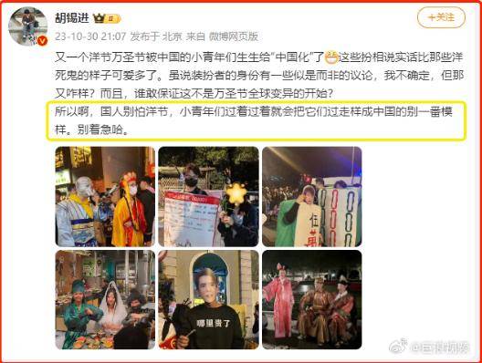 👻 10月30日,胡锡进在自己的社交媒体平台上发文谈到上海的万圣节活动时说:“又一个洋节万圣节被中国的小青年们生生给‘中国化’了。”🌟这一论断引发热议。