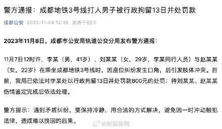 2023年11月8日,成都市公安局轨道公交分局发布警方通报:11月7日12时许,李某(男,41岁)、刘某某(女,29岁,李某同行人员)与赵某某(女,22岁)在乘坐成都地铁3号线时,因座位纠纷发生口角,后引发肢体冲突。目前,我局已依法对李某处以行政拘留13日并处罚金800元的处罚;待刘某某、赵某某伤情鉴定完成后依法处理。