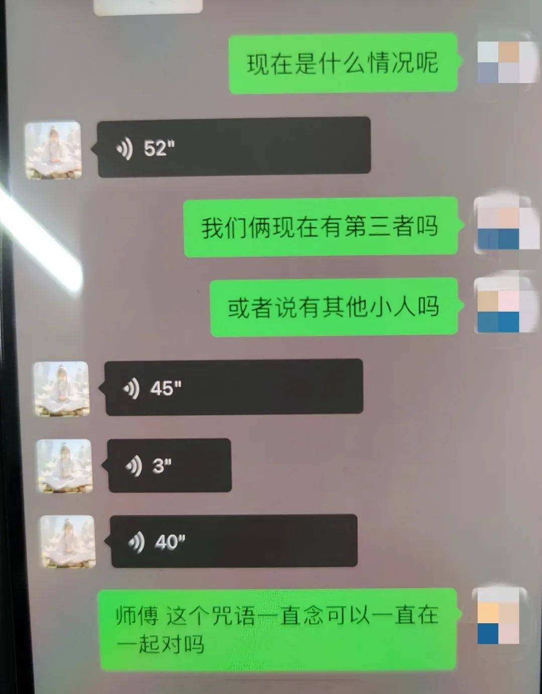 然而又是几天过去了,刘女士仍旧没有等来男友。沉不住气的她又联系了“大师”。这次“大师”没有让她再继续等待,而是“掐指一算”称其中途因“念咒”中断,导致有人从中作梗,阻碍了“气运连接”,所以男朋友没有找她复合。