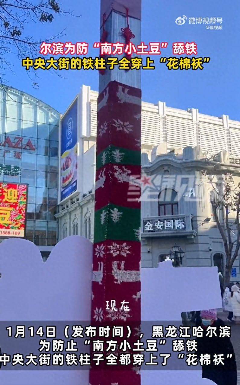 1月14日(发布时间),黑龙江哈尔滨。为防止“南方小土豆”舔铁,中央大街的铁柱子全都穿上了“花棉袄”。