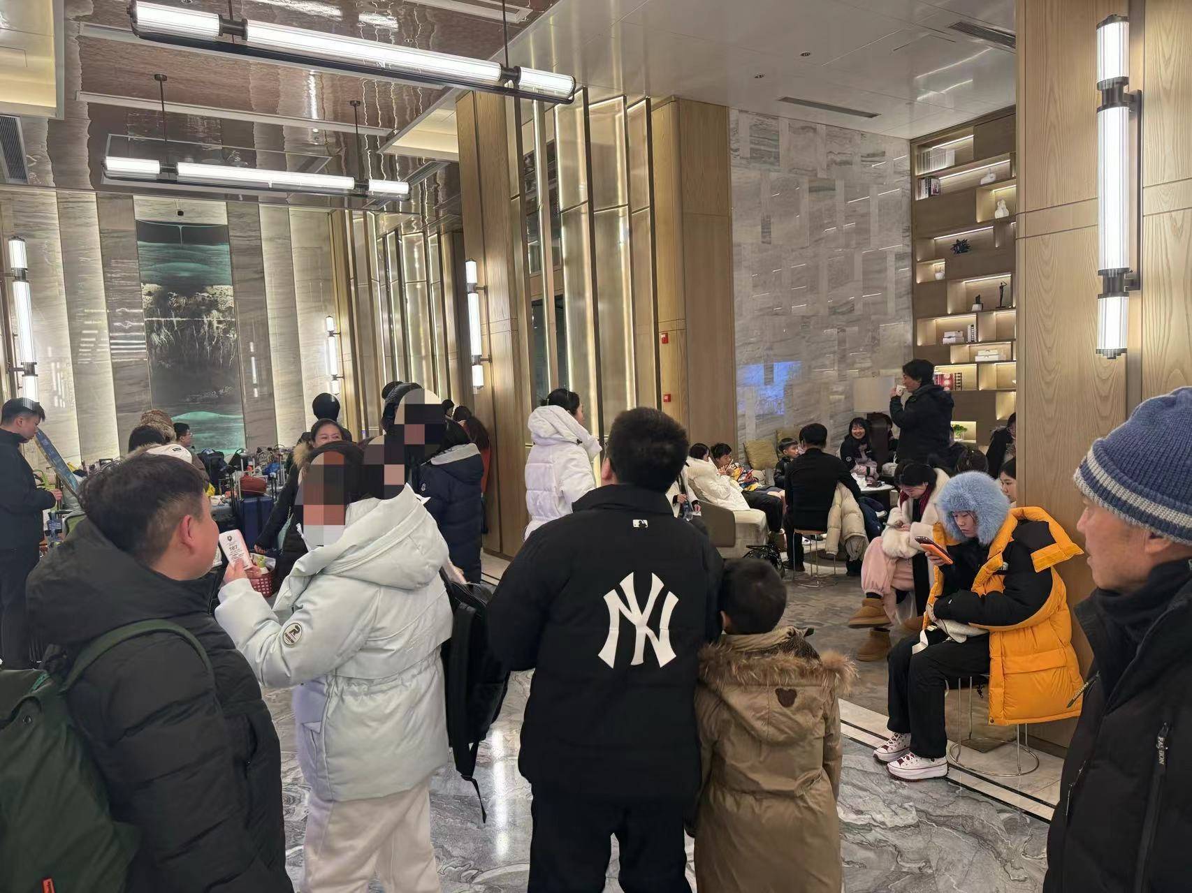 1月19日晚7时许,哈尔滨一所洗浴中心大堂内已存满行李箱。