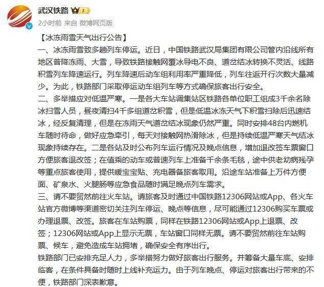 中国铁路武汉局集团有限公司提醒旅客,不要贸然前往火车站。请旅客及时通过中国铁路12306网站或App、各火车站官方微博等渠道密切关注列车停运、晚点等信息,尽可能通过12306购买车票或办理退票、改签。旅客在车站购票,同样在铁路12306网站或App上退票、改签;12306网站或App上显示无票,车站窗口同样无票。请不要贸然前往车站购票、候车,避免造成车站拥堵,确保安全有序出行。