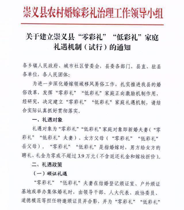 据崇义县官方公布的信息显示,礼遇对象需要是“零彩礼”“低彩礼”家庭对象即新婚夫妻、女方父母。“低彩礼”的标准指的是婚嫁时,男方给女方的聘礼、礼金为零或不超过3.9万元。