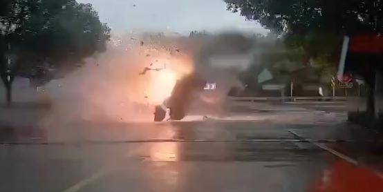视频显示,一辆玫红色的轿车在超速行驶中忽然失控撞上路边障碍物,车辆瞬间被点燃,在空中翻转几圈后冲到路对面,随即被烧成火球,沿路都是掉落的车辆碎片,事发时路面因下雨变得湿滑。