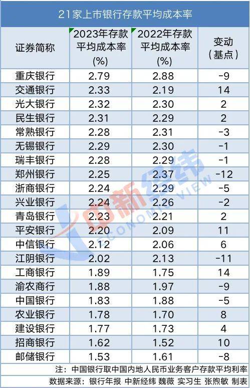 中新经纬梳理发现,21家上市银行中,有11家2023年存款平均成本率下降,降幅最大的是郑州银行,该行存款平均成本率下降12个基点,江阴银行下降了11个基点。但还有10家银行2023年存款平均成本率出现上升。如青岛银行在其年报中指出,2023年,该行存款平均成本率2.23%,比上年提高0.02个百分点,主要是定期存款占比提高所致。