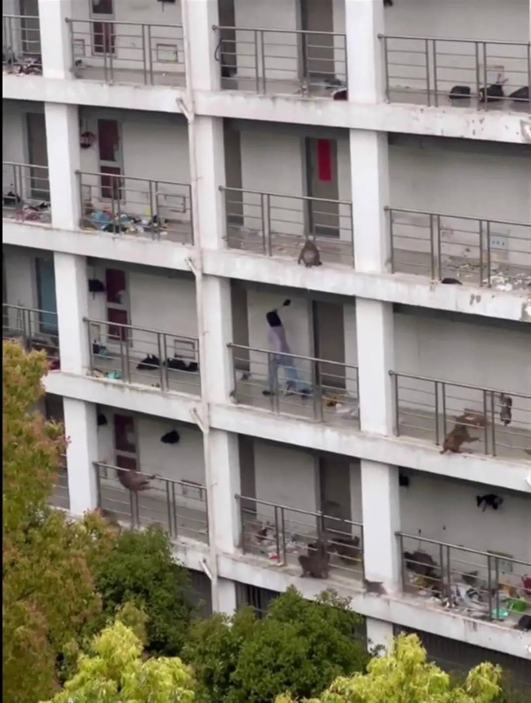 网络视频显示,多只猴子在一栋大学生宿舍的走廊上奔跑,一名女生拿着一把伞一路驱赶;大楼多层走廊上的垃圾袋也被猴群弄破,地面上一片狼藉。