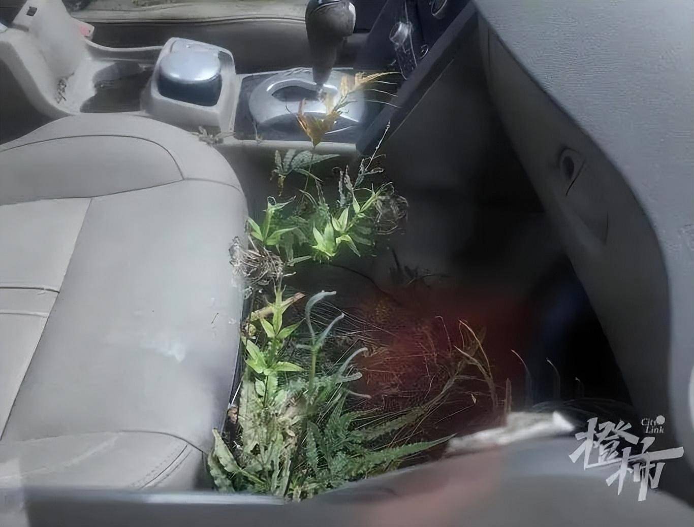 正如橙友反映的那样,这辆车副驾驶座的地板上居然长草了,蕨类植物,有几枝枯死了,倒在车垫上,但更多的长势良好,已经高过座位。上午阳光正好,照进副驾驶,看得清清楚楚。