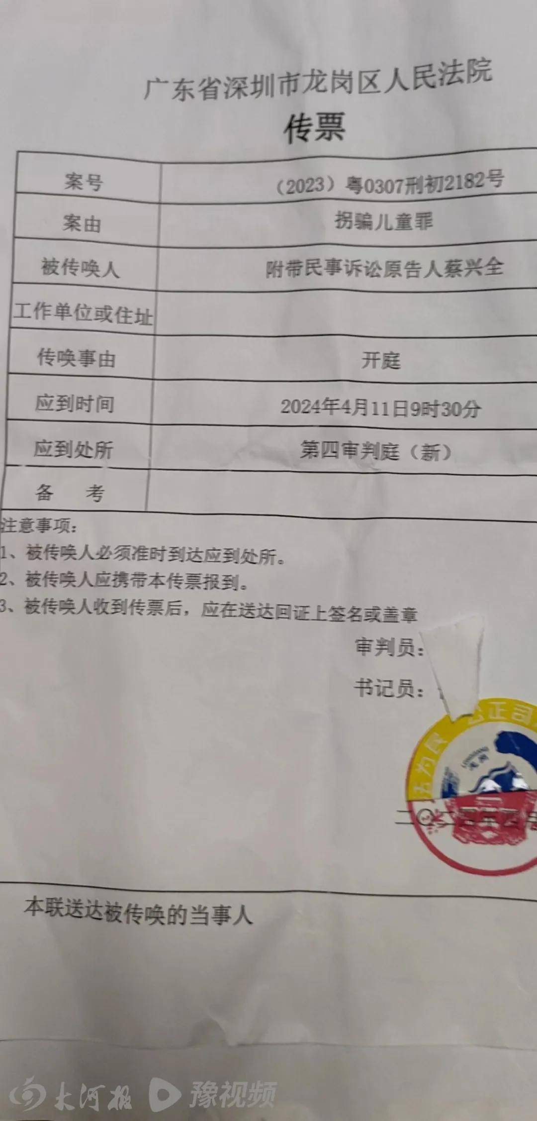 2024年4月10日,《看见》记者从蔡兴全处获悉,张某君涉嫌拐骗儿童罪一案将于4月11日在深圳龙岗区法院开庭审理。