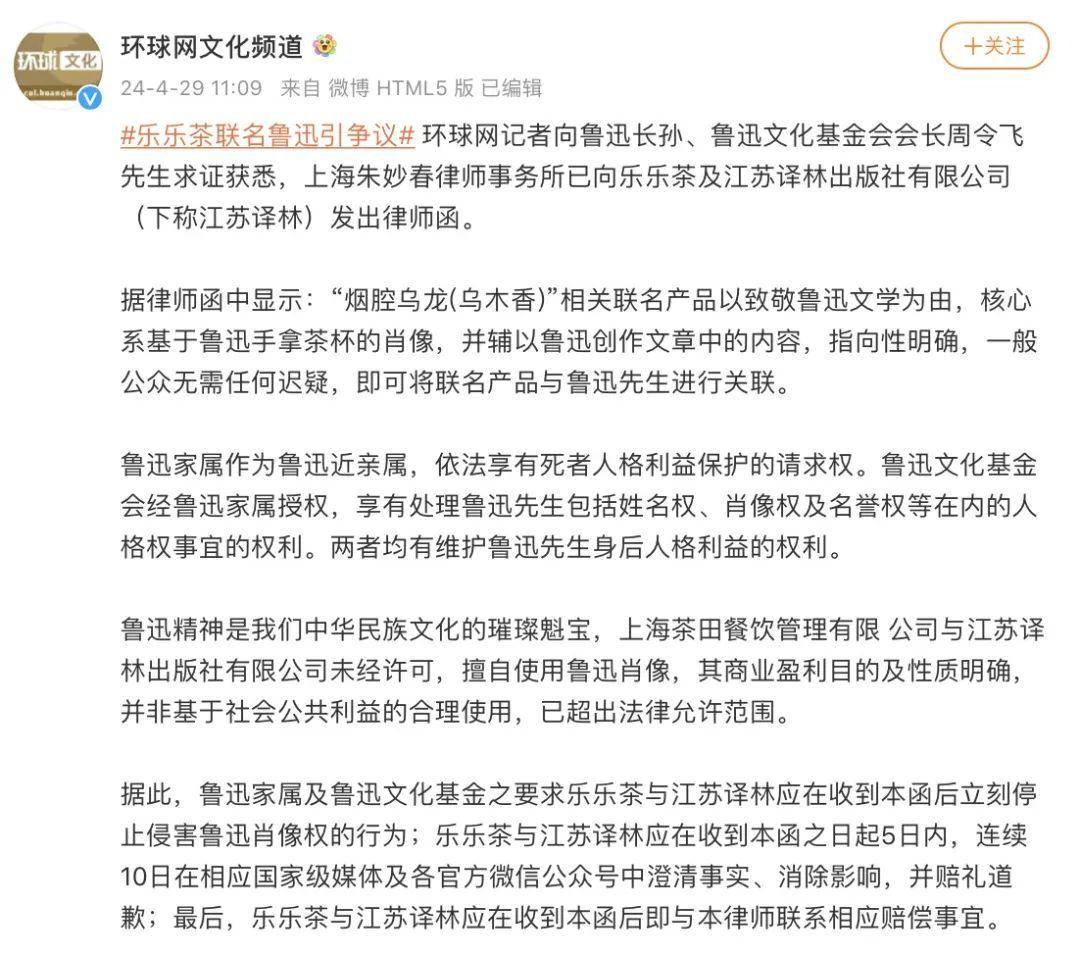 据环球网消息,鲁迅长孙、鲁迅文化基金会会长周令飞先生称,上海朱妙春律师事务所已向乐乐茶及江苏译林出版社有限公司(下称江苏译林)发出律师函。