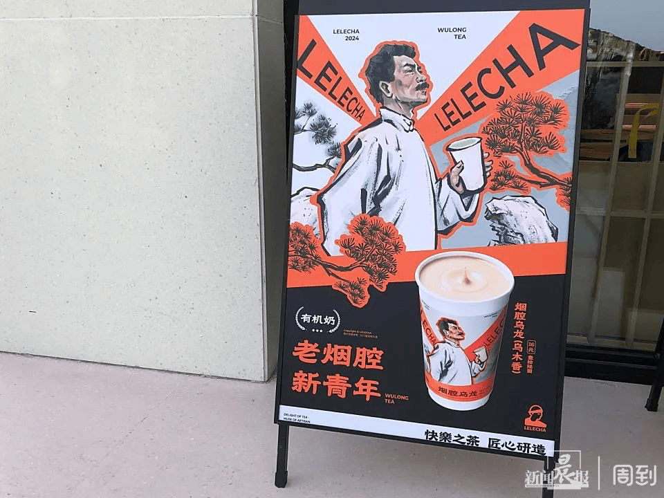 4月23日世界读书日,乐乐茶联合译林出版社,推出了“烟腔乌龙”联名奶茶,致敬文学家鲁迅。除了杯身印有鲁迅手捧奶茶的肖像外,“烟腔乌龙”还配套推出印有鲁迅肖像的小册子、亚克力立牌、纸袋等,产品的宣传标语是“老烟腔,新青年”。