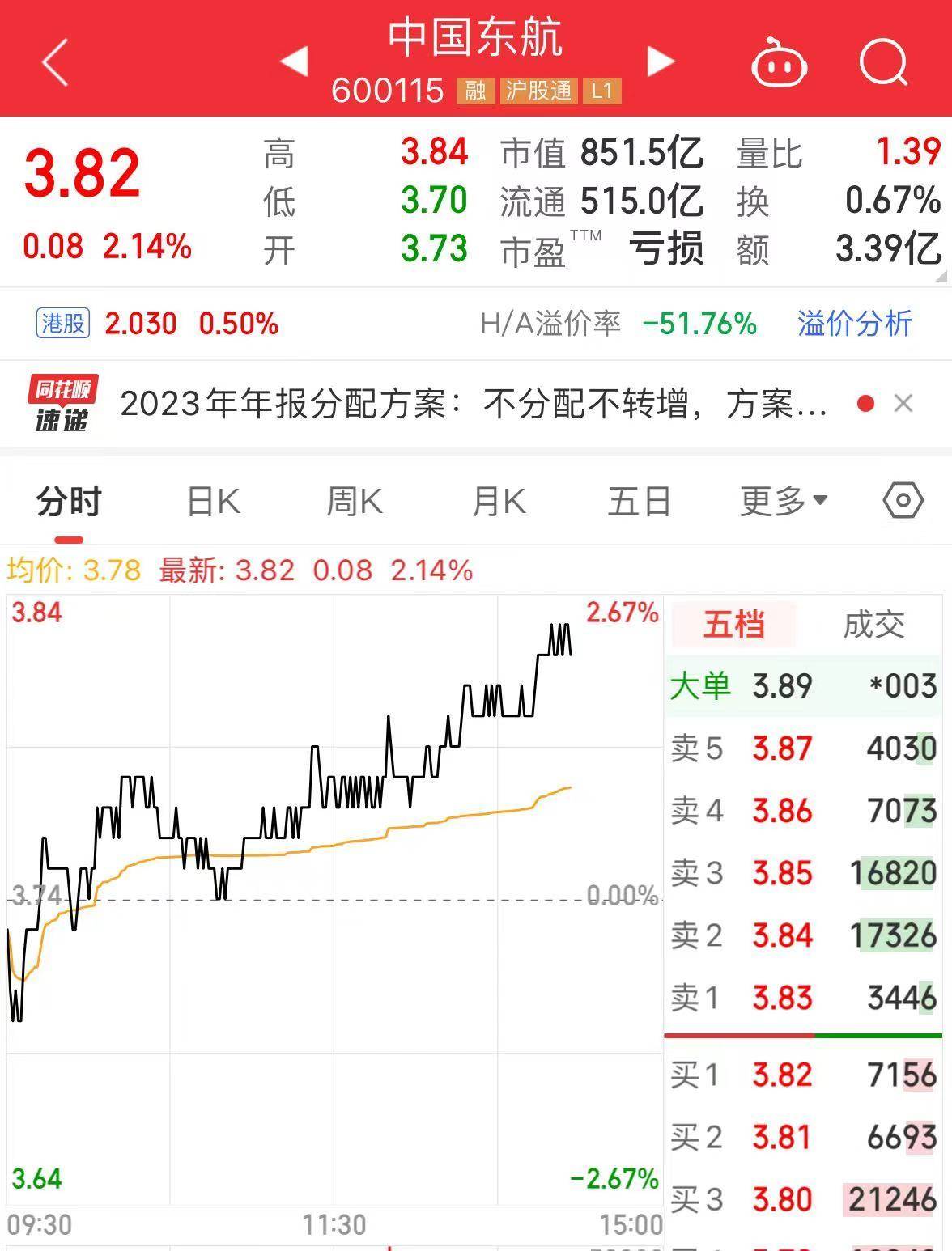 截至发稿,中国东航股价涨2.14%,报3.82元/股,总市值851.5亿元。