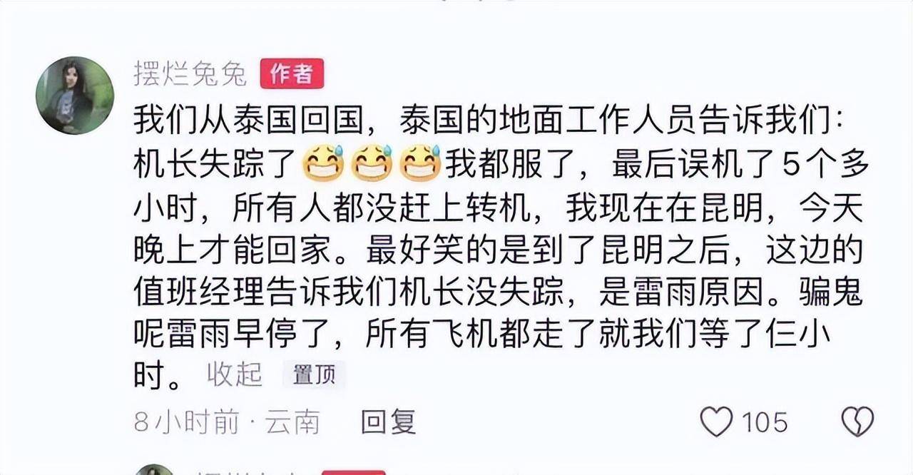 “当时的具体情况是,曼谷机场的地勤跟我们说机长失联,包括广播也播放了机长失联。延误了我们5小时后,飞到昆明又告诉我们延误是天气原因,没有赔偿,给我们安排酒店。而且一开始没有说换机组,只是失联,机长正在赶来,后来乘客们群情激愤,地勤才说换了一个机组。”“摆烂兔兔”表示,“机长确定是没出去玩,但是出机场干嘛了,真不知道。风雨延误无所谓,但是告诉我们找不到机长延误了,然后延误这么久。最后换了整个机组,才飞回国。”