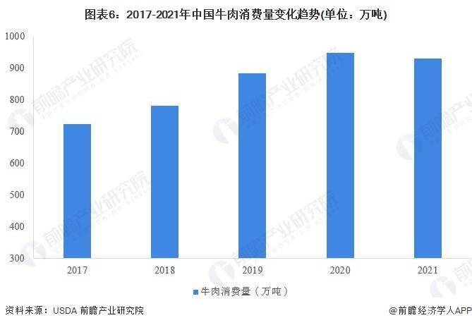 据USDA统计数据显示,从消费量来看,2019年,我国牛肉消费量超过巴西,成为仅次于美国的全球第二大牛肉消费市场。数据显示,2020年我国牛肉消费量为948.6吨。结合2021年我国牛肉产量及进出口规模估算,2021年,我国牛肉消费量约为930万吨。