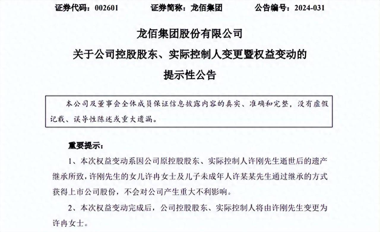 1个月前,龙佰集团董事会沉痛公告,公司控股股东、实际控制人、名誉董事长许刚于5月20日因病医治无效不幸离世,享年61岁。公司当时表示,许刚持有的公司股份将按法律、法规办理继承手续。