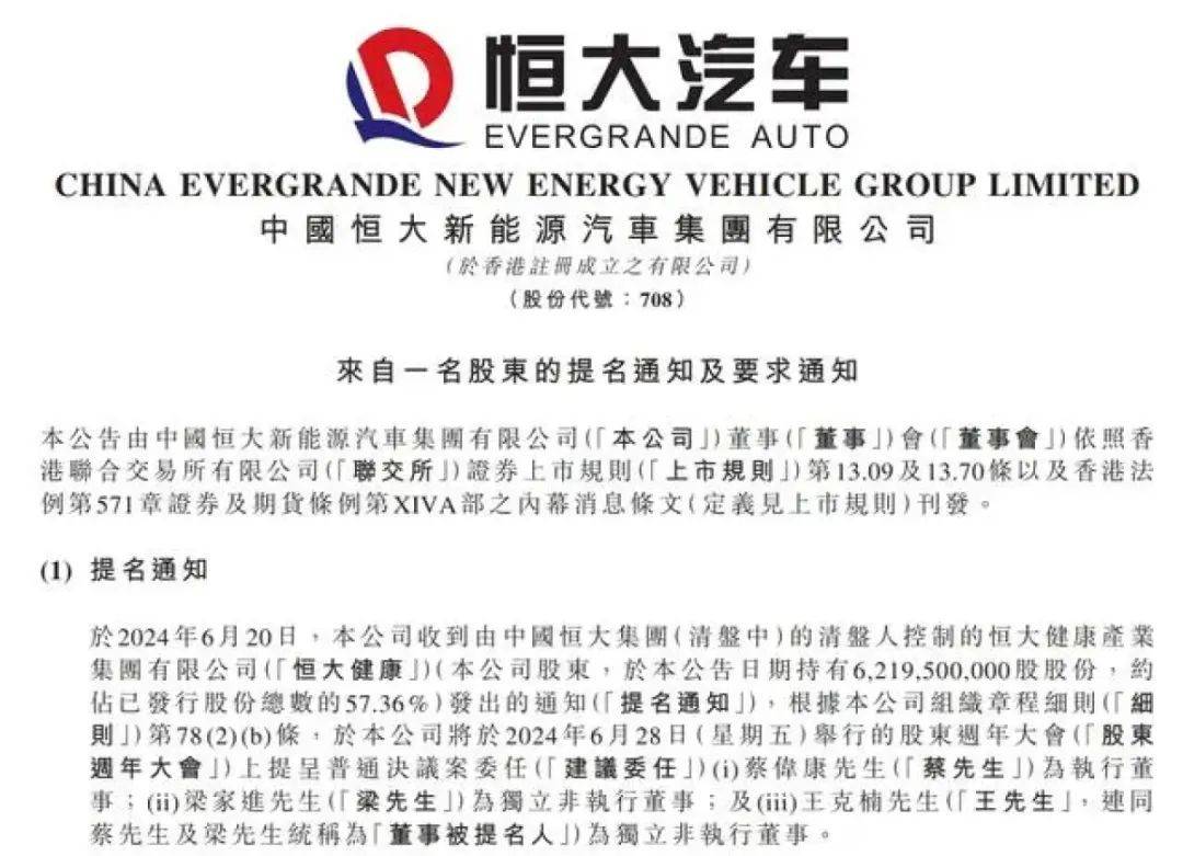 6月27日晚间,恒大汽车(HK0708,股价0.425港元,市值46.09亿港元)发布公告称,恒大健康要求董事会即时召开股东大会并在公司条例第567条规定的时间内举行股东大会,以考虑及酌情通过有关建议委任蔡伟康、梁家进、王克楠三名董事,及罢免执行董事刘永灼、秦立永以及彼等在公司担任的任何职位的普通决议案,即时生效。