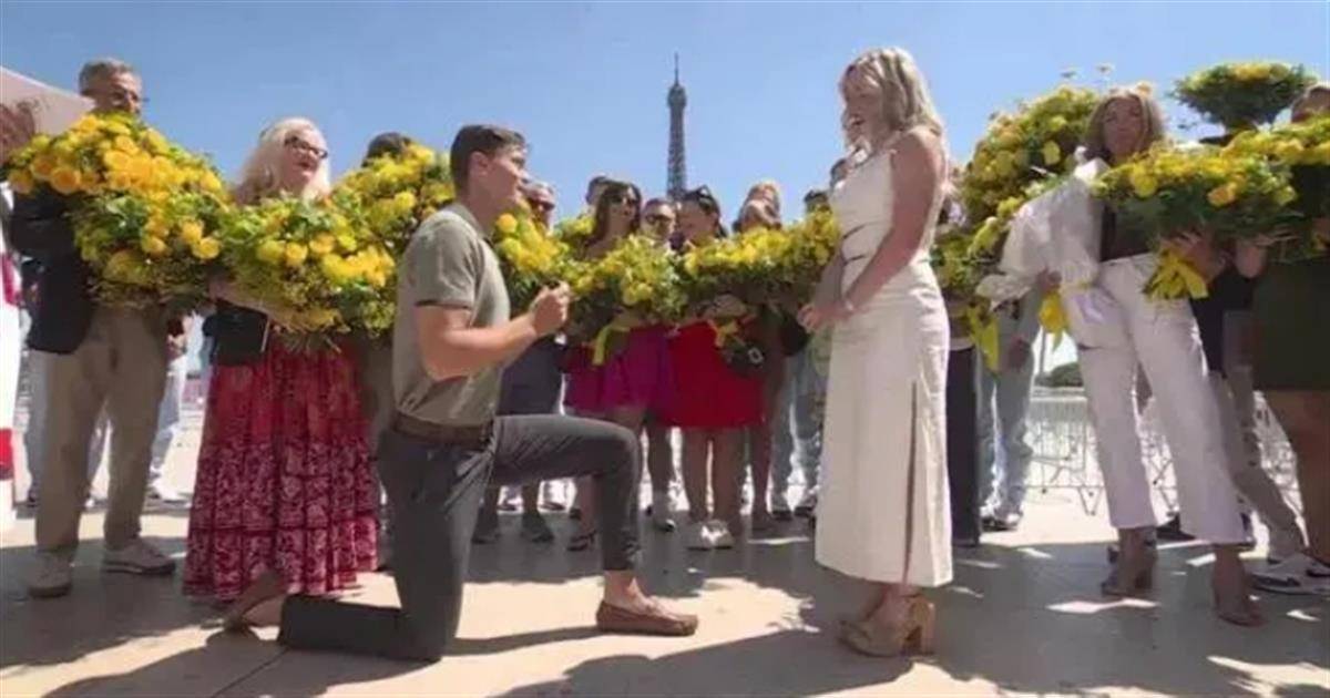 8月5日,巴黎埃菲尔铁塔前,刚刚夺得巴黎奥运会男子四人赛艇金牌的美国运动员贾斯汀·贝斯特单膝跪地,向女友莱尼·邓肯求婚成功。