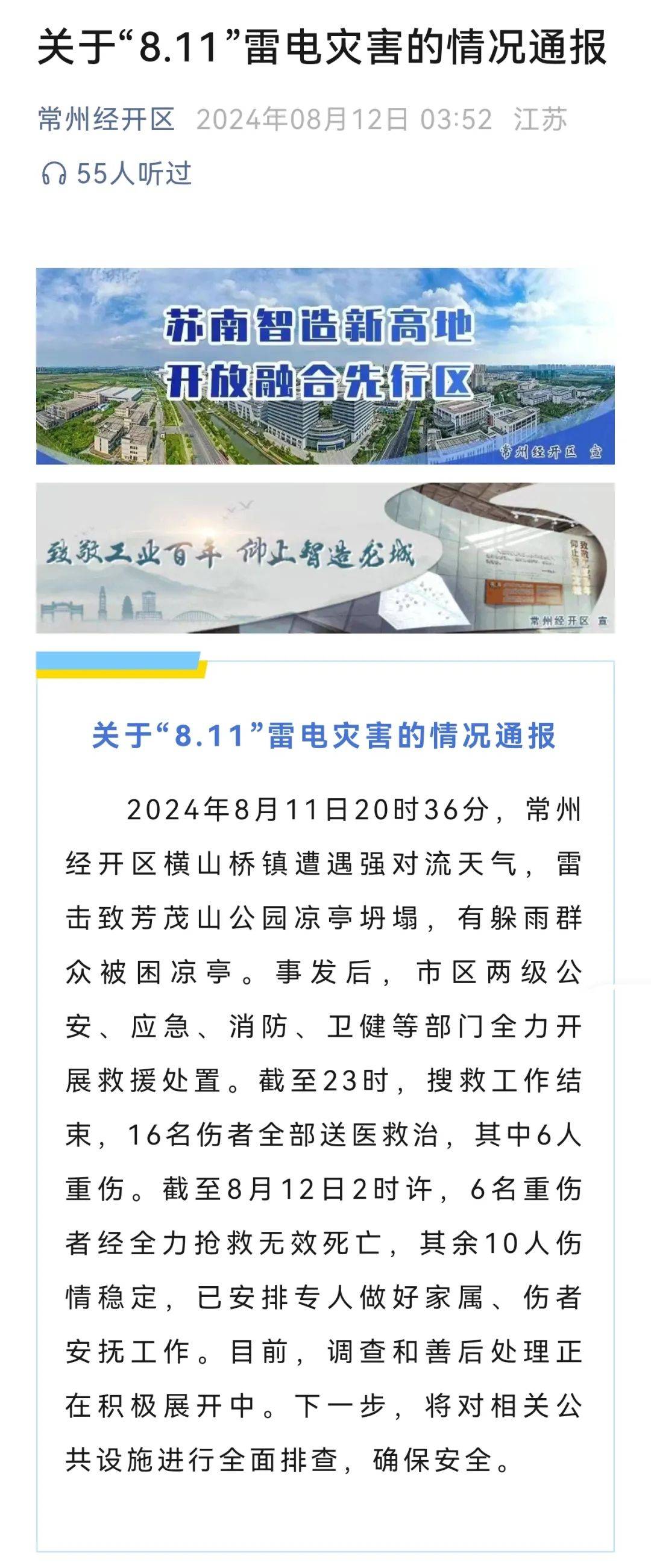8月12日,江苏常州经开区通报“8·11”雷电灾害情况。通报称,11日20时36分,常州经开区横山桥镇遭遇强对流天气,雷击致芳茂山公园凉亭坍塌,有躲雨群众被困凉亭。截至12日2时许,6名重伤者经全力抢救无效死亡,其余10人伤情稳定。目前,调查和善后处理正在积极展开中。