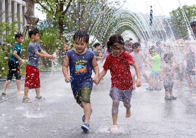 2022年8月14日,在韩国首尔,儿童在喷泉处戏水纳凉。新华社发