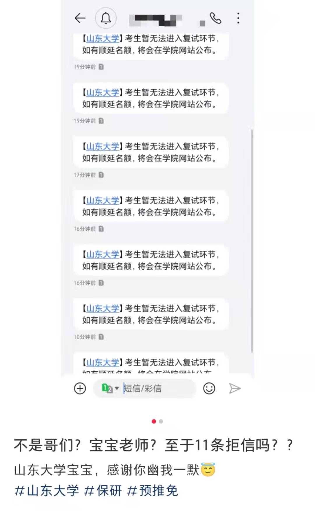 近日,多名考生在网上反映,在参加山东大学2025年保研中,一连收到该校多条“未能进入复试”的通知短信。截图显示,收到的短信从几条到十几条不等。也有网友反映,进了复试也收到了多条通知短信。