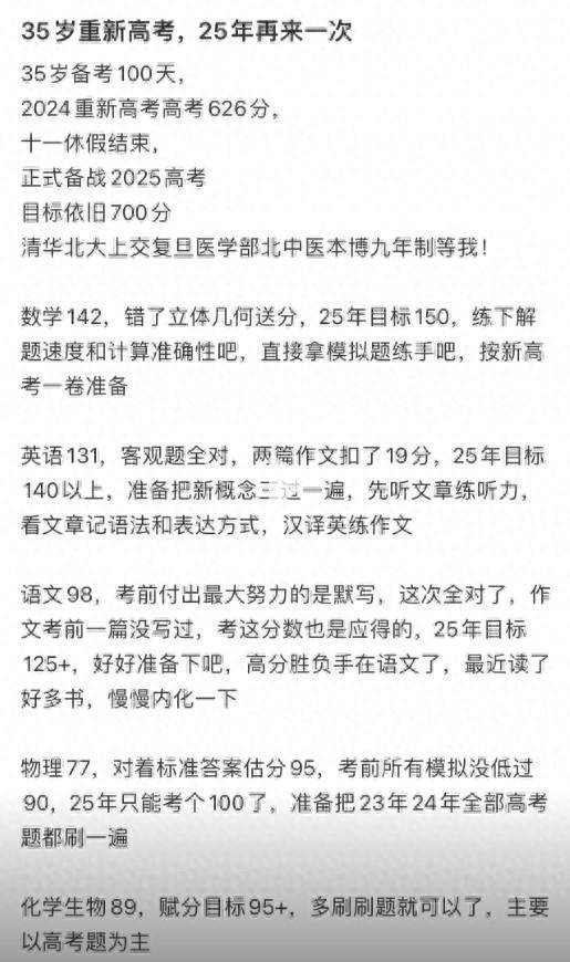 10月4日晚,35岁再考清华的当事人 清华李龙数学在个人社交账号上发布视频,称十一休假结束,备战2025年高考,目标依旧是700分,“清华北大上交复旦医学部北中医本博九年制等我”。