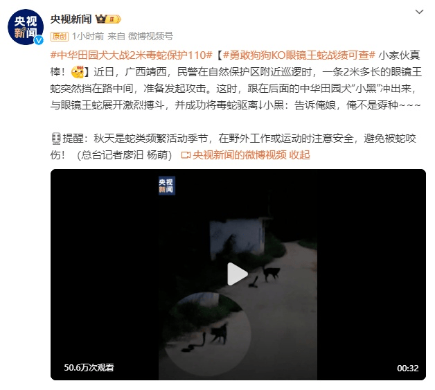 这条中华田园犬没有丝毫畏惧,直面眼镜王蛇。它不断地吼叫、扑咬,与毒蛇展开了激烈的搏斗。眼镜王蛇试图攻击,但中华田园犬灵活地躲避着,并持续发动攻击,最终成功将毒蛇驱离。而民警也因这条勇敢的狗狗,避免了可能遭遇的危险,可谓是中华田园犬成功保护了“110”。