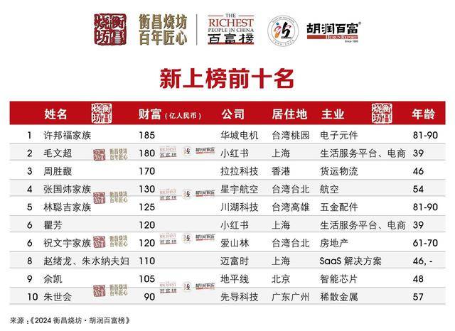 在今年的新上榜企业家中,小红书的毛文超和瞿芳分别以180亿元和120亿元的财富上榜。他们用11年时间将小红书打造成中国的超级独角兽企业,今年7月小红书完成新一轮融资,目前估值已达1200亿。小红书凭借其独特的社交电商模式和丰富的内容生态,吸引了大量年轻用户的关注,目前月活用户超过3亿。另外,拉拉科技的周胜馥也以170亿元的财富新上榜。今年上半年,货拉拉营收近50亿,比去年同期增长18%。该平台促成的已完成订单超过3亿笔,全球货运总交易额达300多亿人民币。