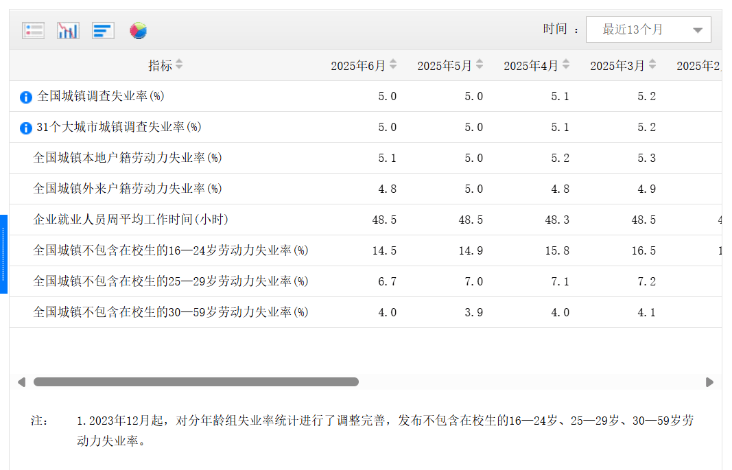 2023年12月起,国家统计局对分年龄组失业率统计进行了调整完善,发布不包含在校生的16-24岁、25-29岁、30-59岁劳动力失业率。国家统计局表示,发布不包括在校学生的16-24岁劳动力失业率,更精准监测进入社会、真正需要工作的青年人的就业失业情况,同时,增加发布不包括在校学生的25-29岁劳动力失业率,更完整反映青年从学校毕业到稳定工作过程中的就业失业全貌。