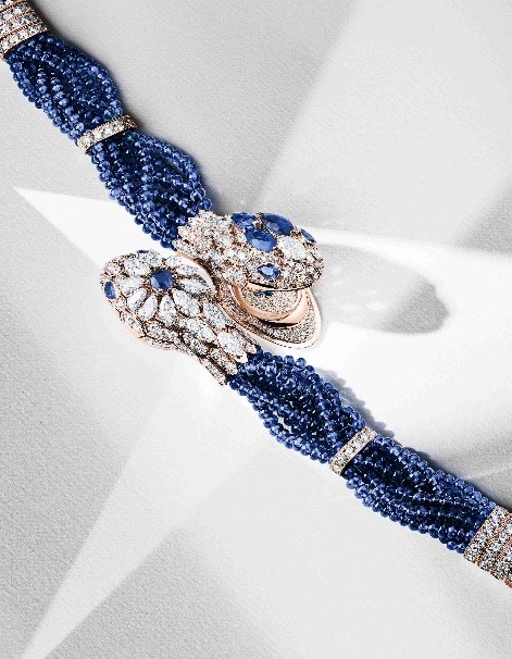 宝格丽Serpenti Misteriosi Intrecciati编珠蓝宝石神秘腕表将双头蛇元素与编珠手链巧妙结合,交织出富有生气的流畅线条,流转腕间。表链上镶嵌426颗蓝宝石珠粒,总重超100克拉。