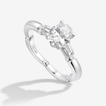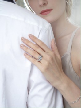 “Blossom系列构筑了一座灵性的秘密花园,在钻石的点缀中魅力绽放。花瓣造型的戒圈上,两颗异形白钻与其融为一体,烘托着花瓣中心的主钻,幸福流连于指尖。”