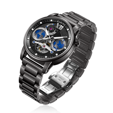 RARONE雷诺表银河系列8860419品牌手表造型前卫,张扬个性。整表以精钢锻造而成,表盘以镂空造型呈现,个性的造型设计与精湛工艺,同时在线,完美释放型格魅力;3时和9时位设计了对称双球体造型,将宇宙的逻辑奥秘呈现于腕间,让佩戴者感受律动的节奏和浪漫;多层次表面,增加立体感,搭配精雕镂空表耳,时尚与经典的碰撞,尽显阳刚气质。镂空表盘配合透视底盖,机械的律动之美,一览无余,演绎雷诺腕表独树一帜的前卫潮流。