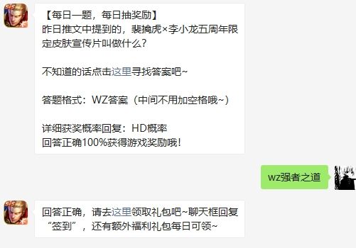 原标题:裴擒虎×李小龙五周年限定皮肤宣传片叫做什么 王者荣耀10月17日微信每日一题答案