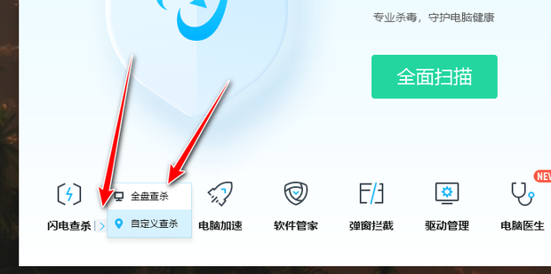 2、然后点击闪电查杀中的全盘查杀,如下图所示。