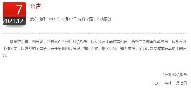 以下为官方公告全文:经研究决定,即日起,郑智出任广州足球俱乐部一线队执行主教练兼球员。希望俱乐部全体教练员、运动员及工作人员,以强烈的荣誉感、责任感和团队意识,排除万难、刻苦训练、奋力拼搏,全力以赴完成本赛季的比赛任务。