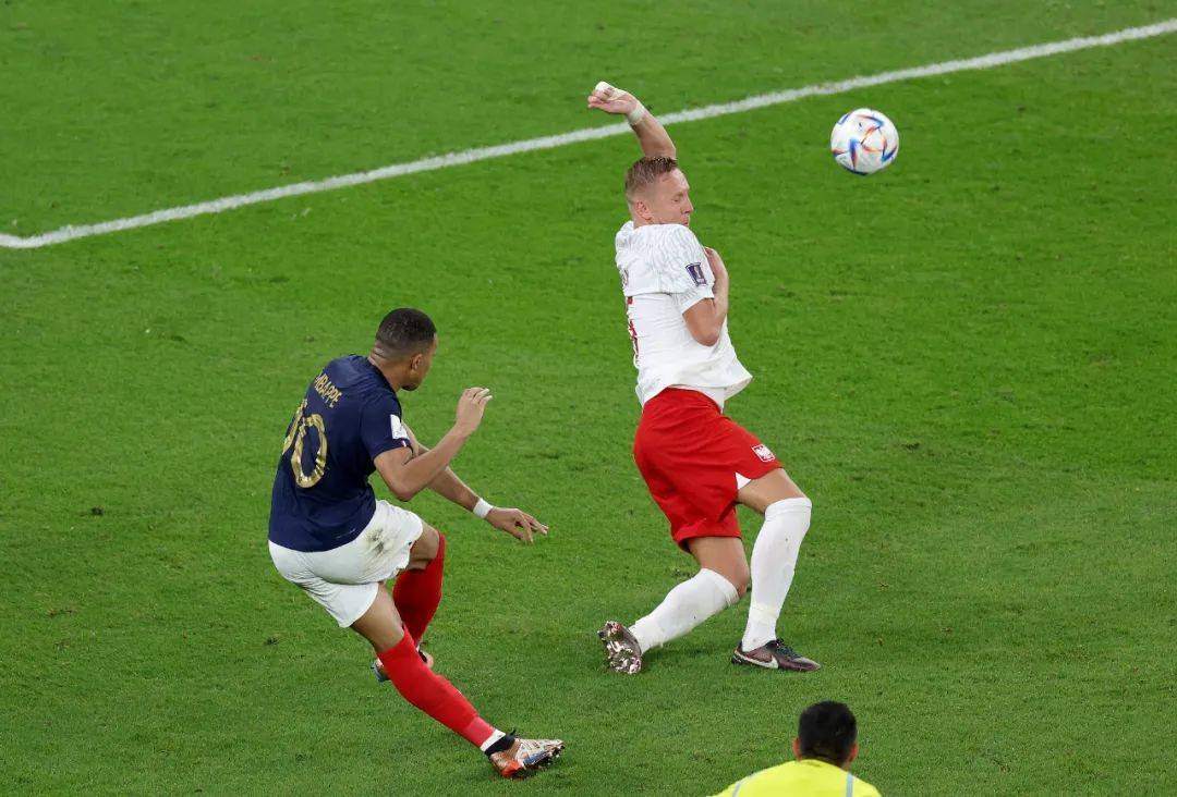 补时最后时刻,法国队后卫于帕梅卡诺禁区内手球,主裁判观看录像回放后判罚点球,莱万为波兰队挽回颜面。