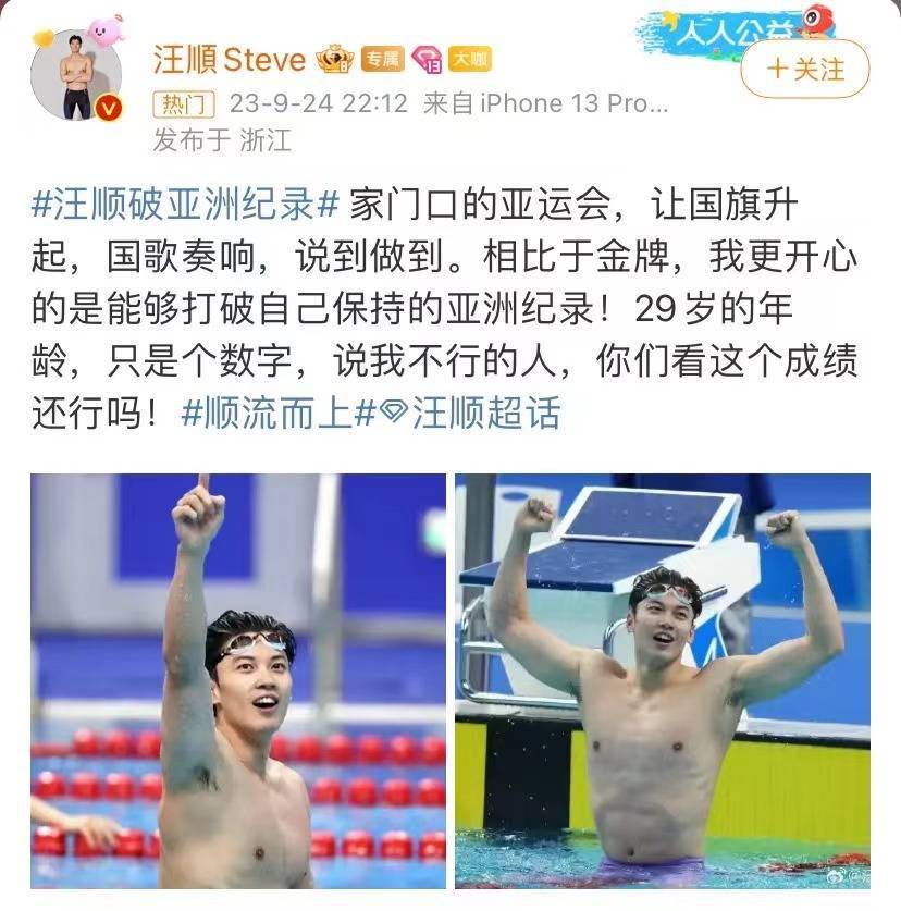 赛后,汪顺在微博发文表示:家门口的亚运会,让国旗升起,国歌奏响,说到做到。相比于金牌,我更开心的是能够打破自己保持的亚洲纪录!29岁的年龄,只是个数字,说我不行的人,你们看这个成绩还行吗!