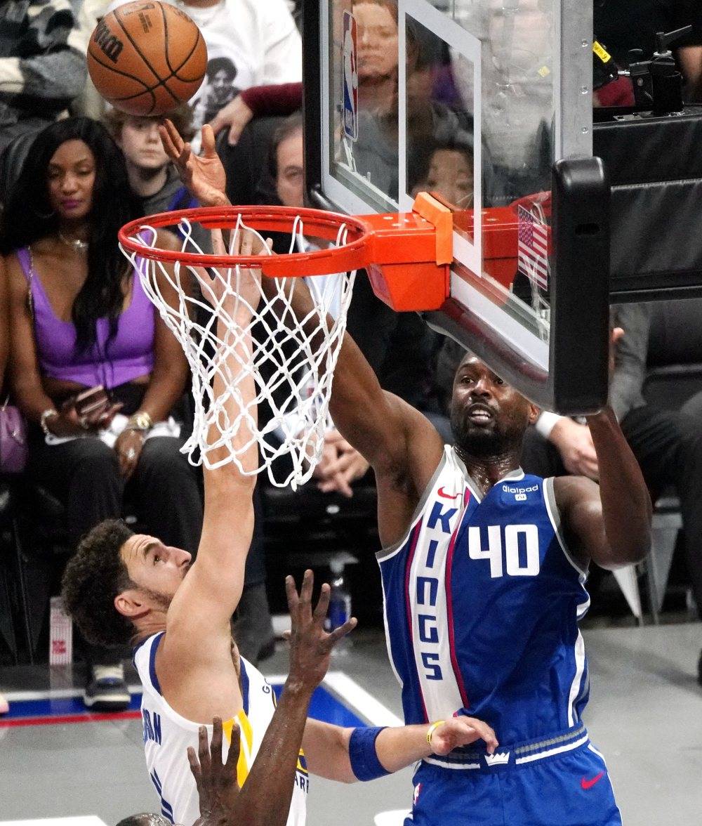 11月28日,勇士队球员凯文·鲁尼(上)在比赛中与国王队球员哈里森·巴恩斯争抢。